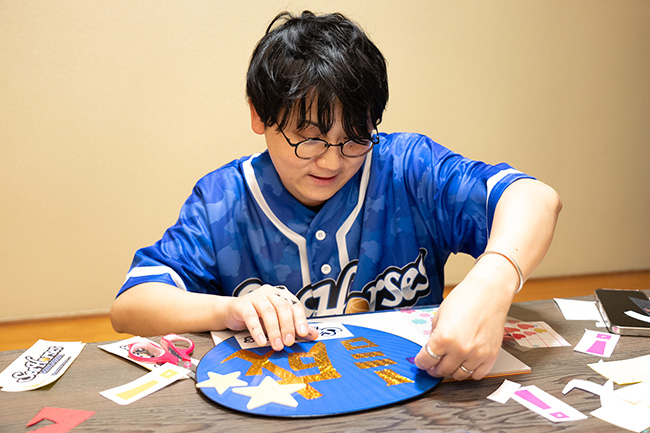 さて、会場入りして初めに行ったのは「デコ応援うちわ」を作ること。シーホース三河のチームカラーにちなんだ「青援スタイル」として、自作したデコうちわを掲げて選手にエールを送ります。