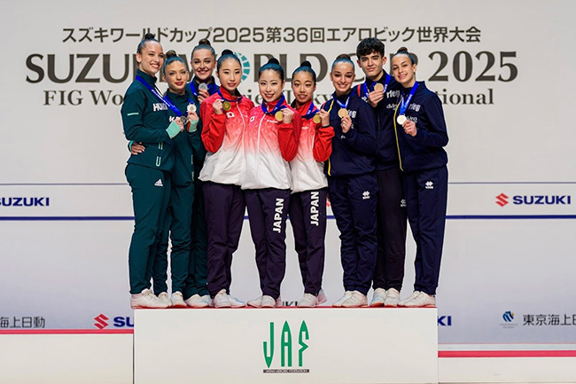 そのエアロビックで昨今注目を集めるのが高校2年生のホープ、知崎百華選手だ。今年4月に行われた「スズキワールドカップ2025第36回エアロビック世界大会」で、ジュニア女子シングル部門で準優勝、ジュニアトリオ部門では優勝を飾った。そのほか、これまで数多くの大会で頂点に輝いている。