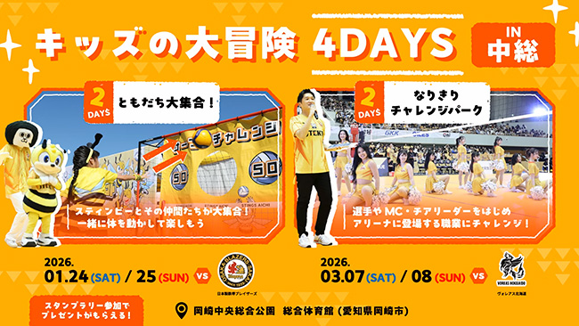 岡崎中央総合公園 総合体育館をホームアリーナとする、SVリーグに所属する「ジェイテクトSTINGS愛知」。総合体育館で行われるホームゲームは、バレーボール観戦だけでなく、家族で一日遊べる仕掛けが盛りだくさんです。