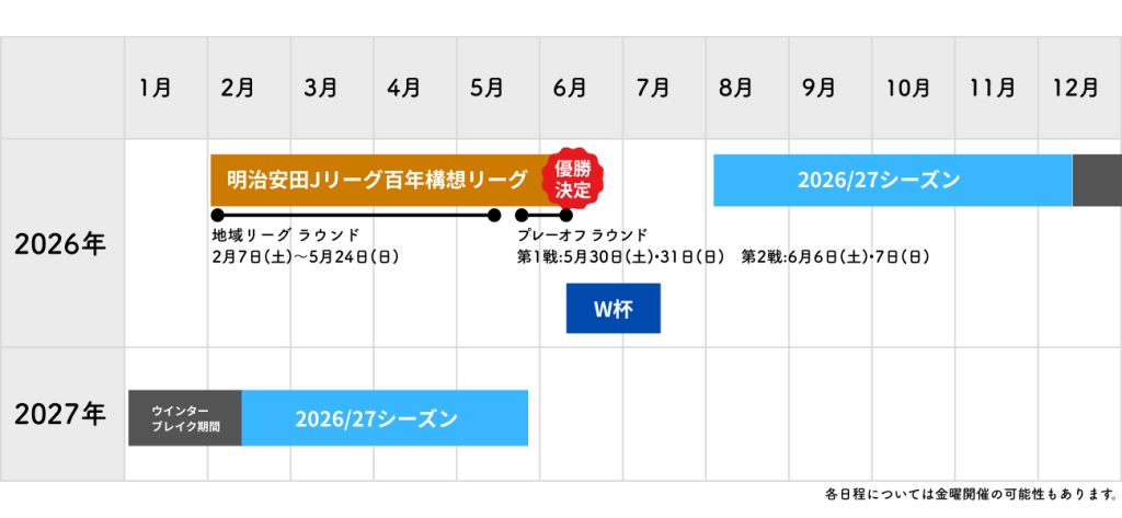 この変更に伴い、新シーズン開幕までに一定の空白期間が生じることから、Jリーグでは2026年だけの特別な大会として「百年構想リーグ」を2月から6月まで開催。