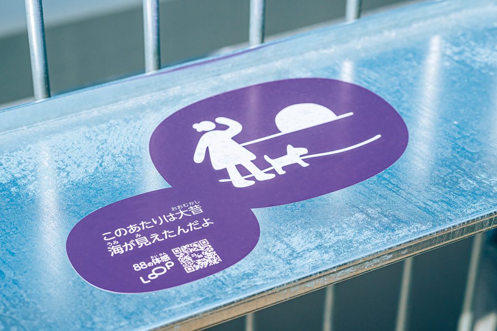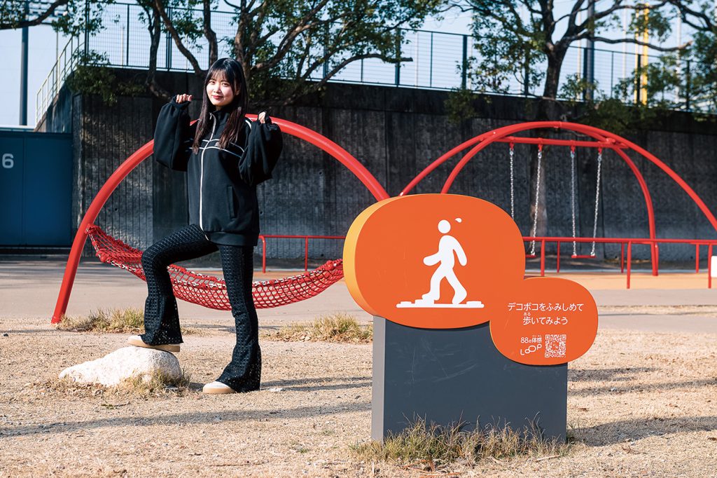 スタジアムを含む公園一帯には、「88の体感LOOP」が設けられている。オレンジはスポーツ、グリーンは自然、パープルは歴史。それぞれのテーマに関連した情報を示したサインが、園内各所に計88個配置される予定。
