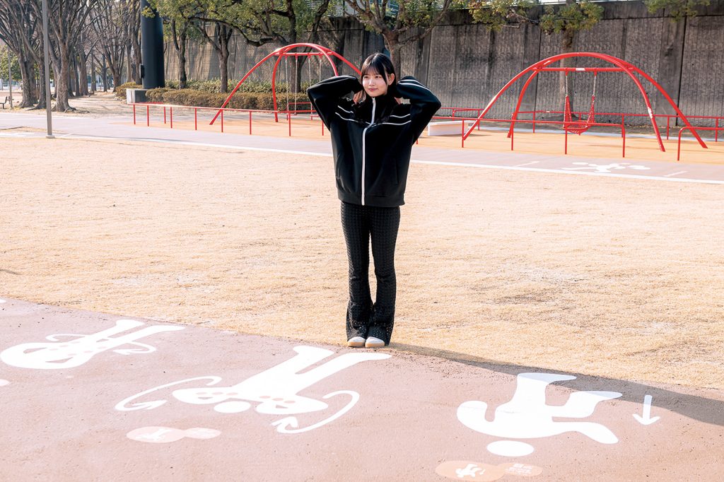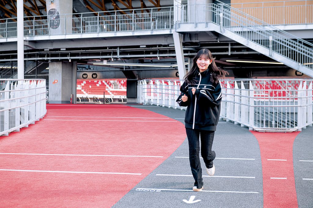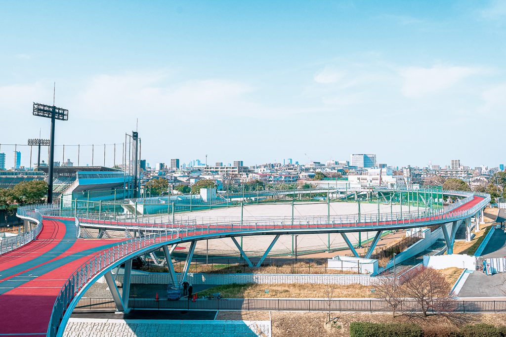 川を挟んで隣接するレクリエーション広場とスタジアムの3階コンコースをつなぐ8の字型の回遊路。スタジアム側が約600m、広場側が約400mで、両方を回ると1kmになる。試合や大会のない日常時は一般開放され、ジョギングや散歩に利用できる。吹き抜け構造のため、夏場は直射日光を避けられ、風も通りやすい。雨の日でも走れる環境が整えられ、天候の影響を受けにくく、伴走者と一緒に走る方を含め、様々な人の「走る・歩く」ルートとして、活用できる。