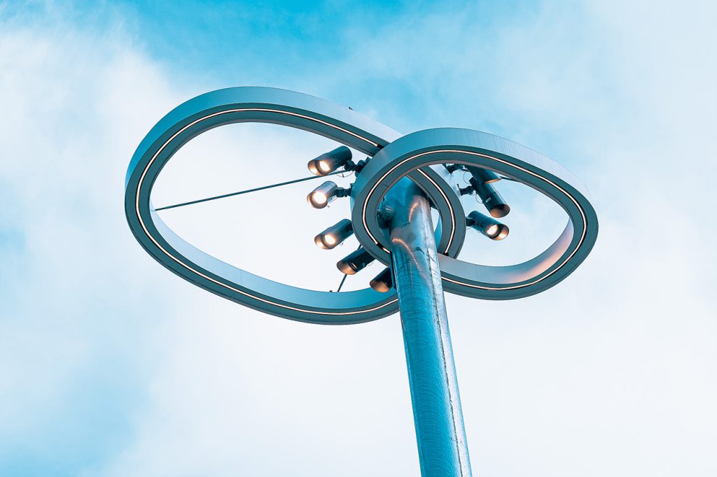 公園内には、8の字の回遊路「MIZUHO LOOP」や樹木をモチーフにしたシンボルが点在。瑞穂の緑をつくる木々を抽象化したシンプルな形を公園全体のデザインコードとし、スタジアム外装の木格子やサイン等に展開している。