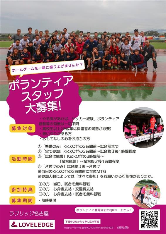 | 概要 | 朝日インテック・ラブリッジ名古屋は、Club Philosophyとして「Keep on Growing」を掲げ、クラブを支えてくださる方々、応援してくださる方々と共に成長し戦っていくことを目指しています。 昨シーズンは多くのボランティアスタッフの皆様のサポートにより、ホームゲーム全11試合を運営、そしてクラブ初優勝をすることができました。 今シーズンも、ホームゲームの運営をサポートしてくださる『ボランティアスタッフ』を募集いたします。 両チームの選手たちが100%のパフォーマンスを発揮できる、また観戦にお越しいただいたファン・サポーターの皆様に存分に試合を楽しんでいただける環境づくりにご協力いただける方の応募をお待ちしております。 皆さんの都合に合わせた形でチカラを貸して下さい ■募集対象 ・やる気があれば、サッカー経験、ボランティア経験等の有無は一切不問 ・高校生以上(未成年は保護者の同意が必要です)※上限は問いません ・思いやりがある方 ・おもてなしの心をお持ちの方 ■服装 ・動きやすく活動に支障のない服装・靴でお越しください。 ・短パン、サンダルは禁止いたします。 ・ボランティアビブスをお渡しします。 ■開催場所 ラブリッジ名古屋ホームゲーム ※現地集合、現地解散となります。 |
